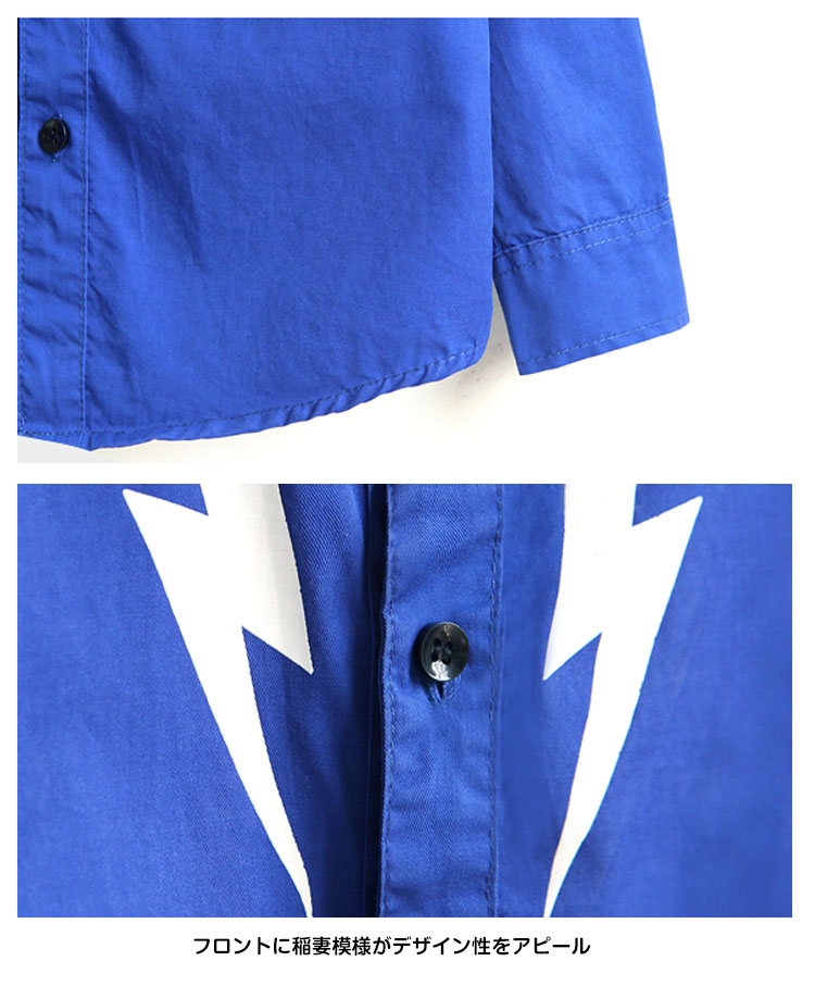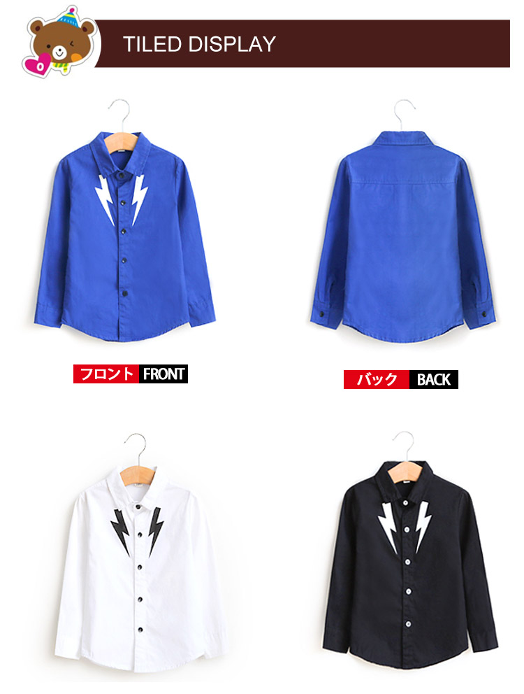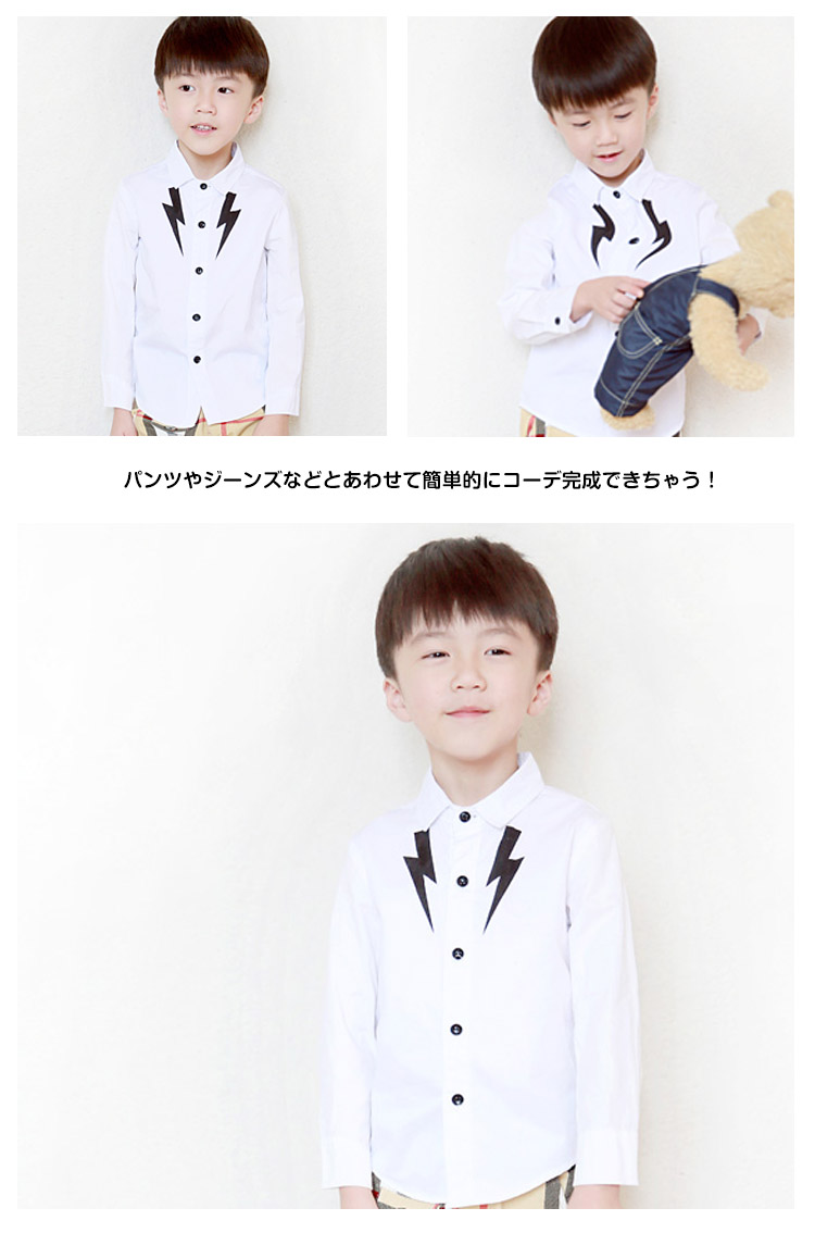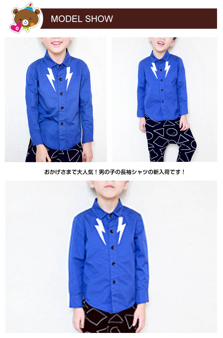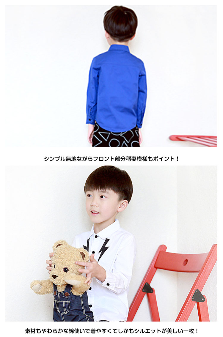 | おかげさまで大人気!男の子の長袖シャツの新入荷です!シンプル無地ながらフロント部分稲妻模様もポイント!素材もやわらかな綿使いで着やすくてしかもシルエットが美しい一枚!パンツやジーンズなどとあわせて簡単的にコーデ完成できちゃう! | |