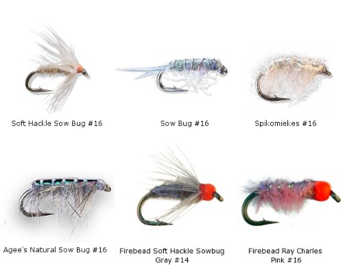 -. Feature : Sow Bugs Flies - from Montana Fly Company / 6 flies = Soft Hackle sow bug #16, Sow Bug#16, Agee's Natural Sow Bug #16 / Firebead Soft Hackle Sowbug-Gray#16, Firebead Ray Charles Pink #16, Spikomiekes#16 / The flies are stored in a 6 compartment plastic fly box