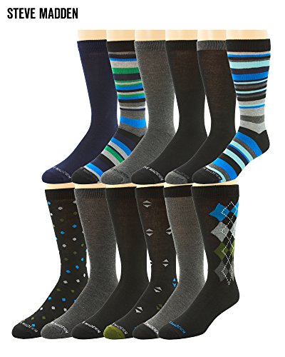 -. Binding : Apparel -. Brand : Steve Madden -. Color : Asst- 1 -. Department : mens -. EAN : 0655091145880 -. Feature : CONTEMPORARY LONG SOCKS FOR MEN - An important part of every man's wardrobe are socks. Dress in style with these socks in conservative hues, a variety of colors and striped patterns to help you find the perfect match to all your different wardrobe needs. / PREMIUM QUALITY - Made with an ultra soft acrylic, nylon and a touch of spandex for long-lasting durability. Designed for the swanky, well put together man with a mix of P.R.Int and style. / COMFORT FIT - Soft, lightweight and breathable, these socks perfectly fit to the contours of your feet to provide full motion support and stability. Socks for all day comfort that look great and feel great! / DRESS & DAILY WEAR SOCKS - These socks will work great underneath your everyday suits or simple attire. Perfect for daily use, for work, as well as those special fancy occasions. Cross your legs more often to show off these classic socks. / SIZE & COLOR - Sizes 10-13. Available in assorted color packs. -. IsAdultProduct : 0 -. Model : 00-HTTB8N-FR -. MPN : 00-HTTB8N-FR -. PartNumber : 00-HTTB8N-FR -. ProductGroup : Apparel -. ProductTypeName : DRESS -. Size : 10-13 -. Title : Steve Madden Mens 12 Pack Patterned Dress Socks, 10-13 -. UPC : 655091145880