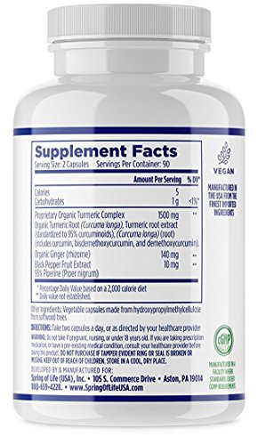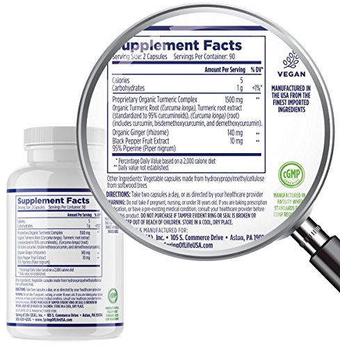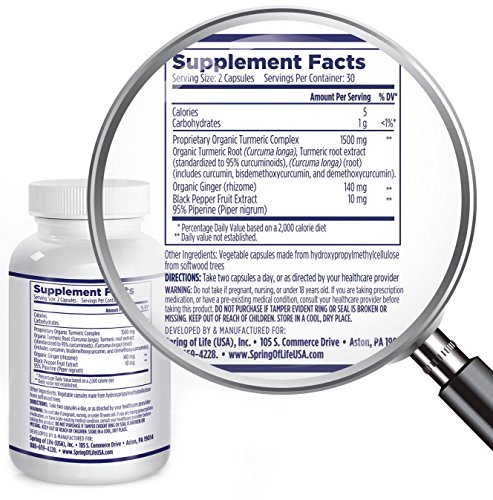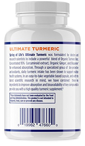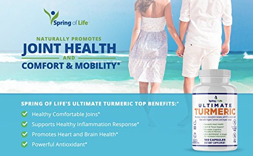 -. Feature : • JOINT COMFORT & TISSUE HEALTH - SP.R.Ing of Life's Ultimate Turmeric Curcumin supplement helps your body maintain a healthy response to inflammation and pain. Ultimate Turmeric is designed to keep you active and moving by supporting multiple health systems throughout your body that are critical to mobility and comfort including inflammation response and joint & tissue health. / • CARDIOVASCULER AND COGNITIVE HEALTH - Turmeric Curcumin has been scientifically shown to support heart health and promote cognitive function and memory. SP.R.Ing of Life's Ultimate Turmeric has been formulated by doctors and scientists to give you the maximum benefit across multiple health systems throughout your body. / • THE ULTIMATE ANTIOXIDANT - Turmeric has been shown to be one of the most potent antioxidants in existence. It's these antioxidant powers that allow SP.R.Ing of Life's Ultimate Turmeric to promote health in so many different parts of the body including brain health, heart health, inflammation response and even individual cell health at the cellular level of your entire body. / • 95% STANDARDIZED CURCUMINOIDS - SP.R.Ing of Life ensures you are getting the highest quality, purest ingredients by using only premium 95% standardized curcuminoids. We then add Bioperine and Ginger to make sure your body can take full advantage of the multiple health benefits of Ultimate Turmeric Curcumin. / • THE BIOAVAILABILTY ENHANCING POWERS OF BIOPERINE® & GINGER - Curcumin is not readily absorbed by the body. That's why we've added two ingredients to boost bioavailability, Bioperine is the patented extract from purified black pepper fruit that has been clinically shown to naturally enhance nutrient absorption. Ginger has also been scientifically proven to enhance the absorption of Turmeric. Bioperine and Ginger work together in our powerful blend.