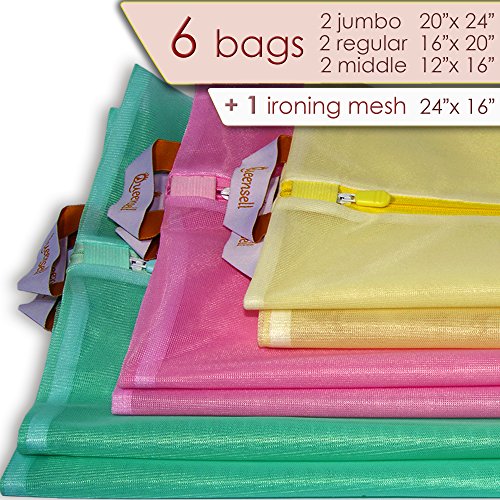 Delicates Mesh Laundry Bag - Hosiery Bag 6+1 Set: 2 Jumbo 2 large 2 Medium & Ironing Clothes - Colored Mesh Washing Drying Laundry Bag for Bra Underwear Lingerie Stockings - Travel Organizer