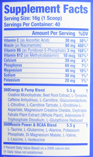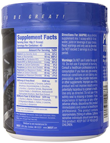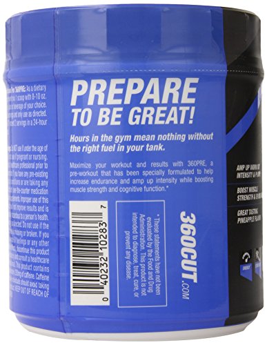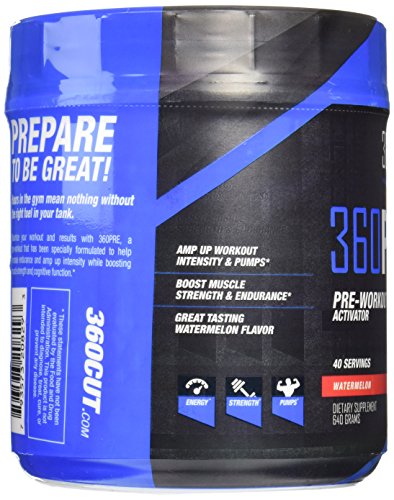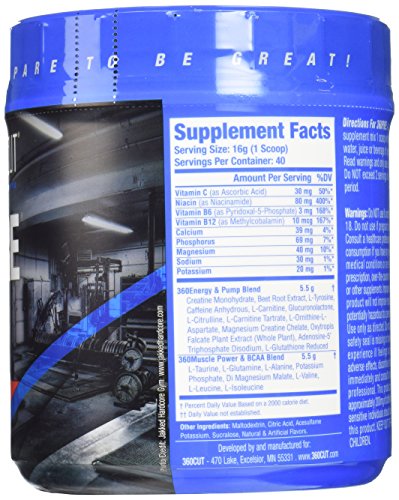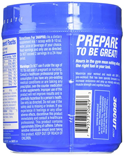 -. Binding : Health and Beauty -. Brand : 360Cut -. Feature : Great tasting pre-training formula fuels increased endurance and workout intensity / Boosts muscle strength, power and mental focus / Promotes optimal muscle fullness and pumps / 40 Servings / Proven safe And effective -. Label : 360CUT -. LegalDisclaimer : Actual product packaging and materials may contain more and different information than what is shown on our website. We recommend that you do not rely solely on the information presented and that you always read labels, warnings, and directions before using or consuming a product. Please see our full disclaimer below. -. Manufacturer : 360CUT -. ProductGroup : Health and Beauty -. ProductTypeName : HEALTH_PERSONAL_CARE -. Publisher : 360CUT -. Studio : 360CUT -. Title : 360CUT 360Pre-Workout Activator, 640 Gram