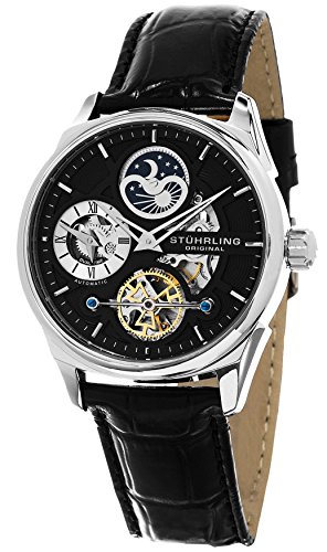 -. Binding : Watch -. Brand : Stuhrling Original -. Color : Black -. Department : mens -. EAN : 0847988079310 -. Feature : Skeleton watch in polished silver tone featuring black guilloche outer dial with subdials for dual time and am/pm indicator / 42 mm stainless steel case with Hardlex dial window / Automatic self-wind movement with analog display / Croco-embossed leather calfskin band with buckle closure / Water resistant to 50 m (165 ft): In general, suitable for short periods of recreational swimming, but not diving or snorkeling -. Label : Stuhrling Original -. Manufacturer : Stuhrling Original -. Model : 657.02 -. MPN : 657.02 -. PackageQuantity : 1 -. PartNumber : 657.02 -. ProductGroup : Watch -. ProductTypeName : WATCH -. Publisher : Stuhrling Original -. Size : Standard -. Studio : Stuhrling Original -. Title : Stuhrling Original Men's 657.02 Delphi Stainless Steel Automatic Self-Wind Dual Time AM/ PM Indicator Watch With Black Leather Band -. UPC : 847988079310