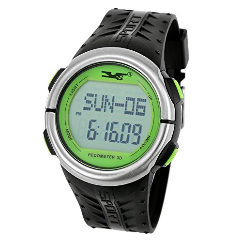 -. Feature : Normal Time: Hour, Minutes, Second, Day and Weekday; 12/24 hr format; Calendar (Yr 2000-2099). 2-set alarm: Daily alarm & hourly chime. / Chronograph ranging from 0 to 59:59:99, with SPL function. Countdown function, up to 23 hr 59 min. / Pedometer function: 7 second smart detection. Three pedometer mode: Total steps / time display mode→ Total steps / exercise time display mode→ calories / mileage display mode. User information settings: Metric / imperial→ weight→ G-Sensor sensitivity. Notice: Most accurate pedometer range, 80~130 steps/minute. / 50-day automatic step storage function. / Heart rate mode: Touch-on pulse measuring, showing dynamic heart rate ranging from 30 to 200. 4 seconds EL backlight.