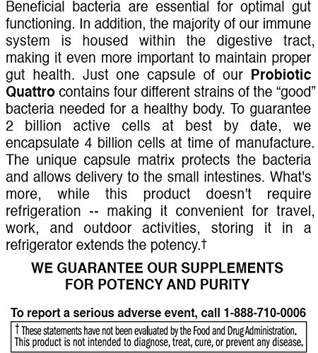 Probiotic Quattro by Natural Nutra – 4 Gut Boosting Strains – Lactobacillus Acidophilus, B. Lactis, and More, 50 Capsules