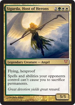 -. Binding : Toy -. Brand : Magic: the Gathering -. Color : Multi-Color -. EAN : 0696736155901 -. Edition : Avacyn Restored -. Feature : A single individual card from the Magic: the Gathering (MTG) trading and collectible card game (TCG/CCG). / This is of Mythic Rare rarity. / From the Avacyn Restored set. -. IsAdultProduct : 0 -. ItemPartNumber : 21 -. Label : Wizards of the Coast -. Manufacturer : Wizards of the Coast -. Model : NA -. MPN : Magic: the Gathering -. PackageQuantity : 1 -. PartNumber : Magic: the Gathering -. ProductGroup : Toy -. ProductTypeName : TOYS_AND_GAMES -. Publisher : Wizards of the Coast -. ReleaseDate : 2012-05-04 -. Studio : Wizards of the Coast -. Title : Magic: the Gathering - Sigarda, Host of Herons (210) - Avacyn Restored -. UPC : 696747772098