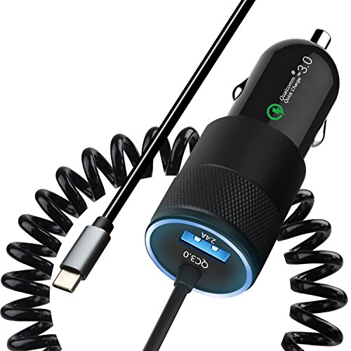 -. Feature : [Ring Indicator]: The Quick Charge 3.0 car charger features an external soft-glow LED ring that lights up when pled in for ease of use at night or in the dark. / [Clever Built-in Lightning Cable]: The cable can extend to 4.5 FT pulled tightly while it naturally extends to approximately 0.5 FT, with first-rate shape retention! Lightweight, and extremely portable, fits in any compact socket space. / [Quick Charge 3.0 USB-C Cable]: Charge QC3.0 enabled devices(such as Galaxy S8/S8 Plus, Moto Z, LG G5, HTC 10, LG V20) at optimal high speed up to its maximum allowance 18W (5V/3A 9V/2A 12V/1.5A) and other non-QC3.0 devices at devices' acceptable speed / [2-Ports Car Charger]: Charge up to 2 devices simultaneously at the full speed and provide uninterrupted use of your devices' navigation and media functions while on the road / [Certified Safe]: CE, FCC & ROHS Certified; Built-in Multi-Protect Safety System against over-current, over-voltage, overload and short circuit, ensures complete safety for you and your devices. Charging will automatically stop when battery is full