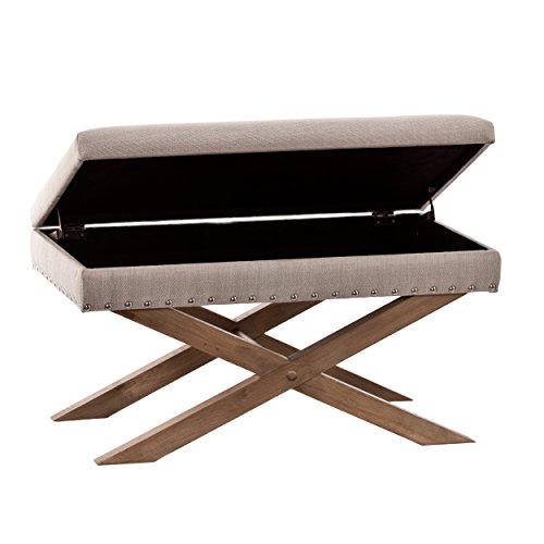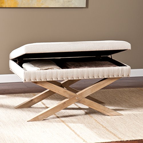 -. Feature : Cream w/ natural ash finish and vintage inspired cottage style / Plush seating rests upon solid wood "X" frame and opens to reveal storage; Velvety black felt protects valuables / Overall: 36" W x 19.5" D x 21.25" H; Seat: 35.5" W x 19" D; Storage: 34" W x 17.5" D x 2.25" H (plus .75" H in lid); Clearance (from the side): 14.5" W x 31.25" D x 7" H / Materials: ash wood, cotton, simulated linen, lint, metal; Supports up to: 250 lb; Approx. weight: 39.5 lb. / Graceful, classic vanity bench design with nailhead trim for a traditional touch