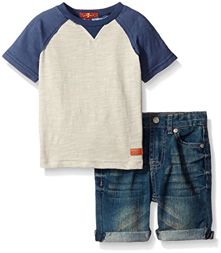 -. Binding : Apparel -. Brand : 7 For All Mankind -. Department : boys -. Feature : Shorts back pocket has signature squiggle / Elastic back waist sizes 0-24 months and adjustable inner waistband sizes 2T - 4T / Rib knit crew neck tee has color block raglan sleeves and v inset -. Label : 7 For All Mankind Children's Apparel -. Manufacturer : 7 For All Mankind Children's Apparel -. Model : B1412 -. PackageQuantity : 1 -. ProductGroup : Apparel -. ProductTypeName : SHORTS -. Publisher : 7 For All Mankind Children's Apparel -. Studio : 7 For All Mankind Children's Apparel -. Title : 7 For All Mankind Boys' 5 Pocket Roll Cuff Bermuda Denim Short and Baseball T-Shirt