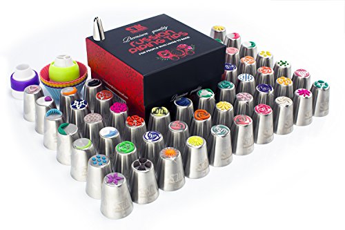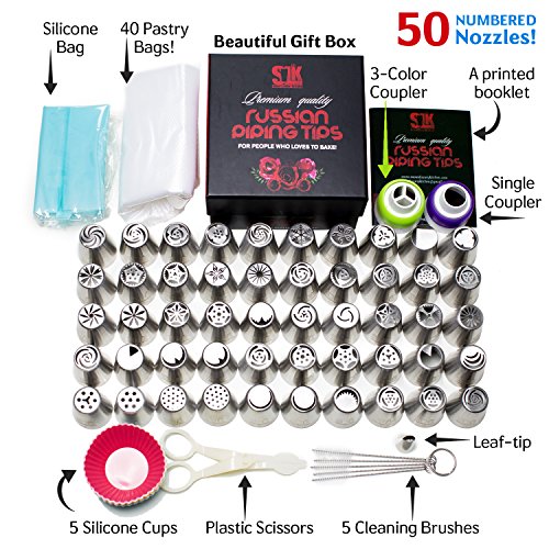 105pc Russian piping tips set, 50 numbered stainless steel nozzles, leaf tip, 3-color+ single coupler, 40 pastry bags, silicon bag, 5 cleaning brushes, GIFT box, plastic scissors & 5 silicon cake cups