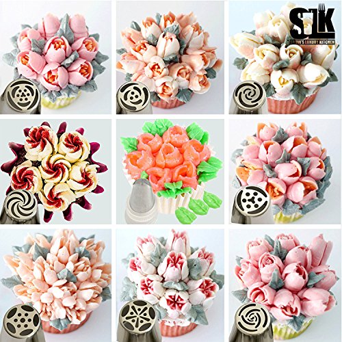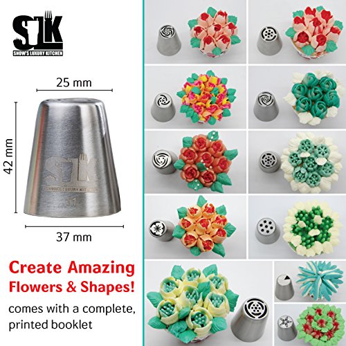 - ✅ GET CREATIVE EASILY: Our professional Russian Icing nozzles will help you create butter-cream roses, stars, lilies, buttons, rosettes, grass, stars, tulips and more! decorate cakes like a pro!
