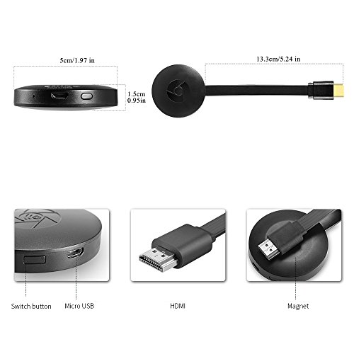 -. Feature : Cast the contents (Video, Game, Audio, Picture, App and File) in your Smart Phones / Tablet PC to another big screen devices with HDMI interface (such as HDTV, Monitor & Projector etc) by using Miracast, DLNA and AirPlay through Wifi connection. HDMI port support 1080P video output and High-quality Sound Effect output. / It support Airplay, DLNA and Miracast, and you can easily enjoy the excellent large display of video from projectors, cell phones, notebook, or Tablet PC. Perfectly to enjoy the ultimate big screen: Watch movies, play games, create your own exclusive cinema. Allows you to enjoy different audio-visual feast. / Support online movies / videos, online TV channels, online webcast/web browsing. Support most video websites(app or online)- YouTube, Facebook, Twitter... Not compatible with the app that requires copyright, like Netflix/ iTunes/ Amazon Video/ HBO go/ Hulu Plus. Perfectly to enjoy the ultimate big screen: Watch movies, play games, create your own exclusive cinema. / This Miracast can mirror online contents on Chrome to HDTV, when playing 3D MSG (Motion Sensing Game), you could use the tablet as the game control, and enjoy it with the big TV screen. It also can be connected to Car HDMI port, transmitting multimedia contents of Smart Phones to the car monitor. Then you will be no longer boring in traffic jam. / Plug and play: no needed any other drivers, and with a switching button, you could switch Airplay mode or Miracast mode easily. Only 3 steps to enjoy the media on large screen: Plug->Connect->Mirroring.