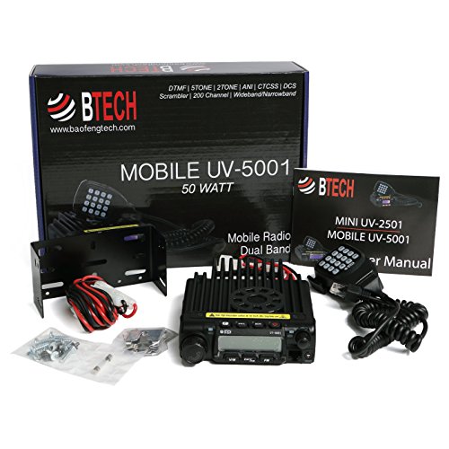 -. Feature : Scrambler/Inversion Chipset, DTMF, 5Tone, 2Tone, CTCSS, and DCS Calling Modes Supported (Remote Kill/Stun Supported) / High / Low Power Settings (50W/10W); Frequency Range: 65-108 MHz(Only commercial FM radio reception) VHF: 136-174 MHz(Rx/Tx). UHF: 400-520 MHz(Rx/Tx); Broad (Wide) / Narrowband (Narrow) Selectable / Recommended Accessories: Pair UV-5001 with the Nagoya UT-72 Magnetic Mount Antenna for easy installation. The PC04 FTDI Cable is recommended for easy computer programming / Dual Watch Delay Time Function: Allows the receiver to stay on the secondary channel longer after incoming transmission - customize the delay up to 50 seconds; This avoids manually channel switching when you are engaged with simulaneous contacts on two frequencies / Kit Includes: BTECH UV-5001, Speaker Mic, 7 foot DC Cable extension with fuse protection, Radio & Mic Brackets, Mounting Hardware, and User Guide