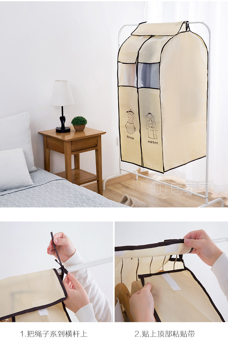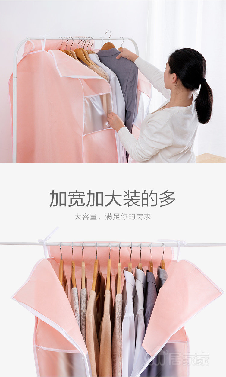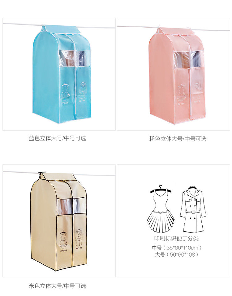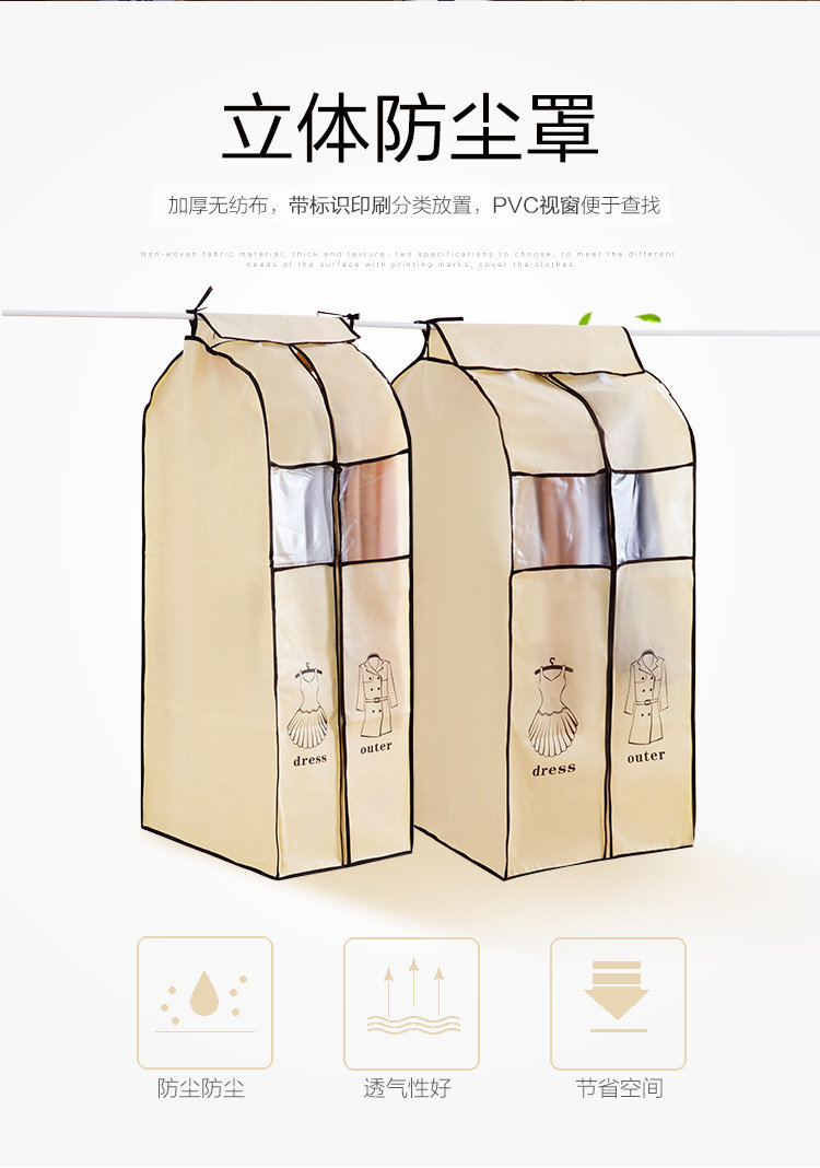 概要: 无纺布材质,厚实有质感,两款规格选择,满足不同需求,表面带印刷标示,罩在衣服上,防尘防污,衬衣、大衣、西装、裙子等都可用,方便你的生活