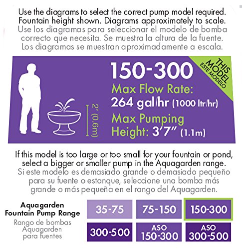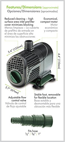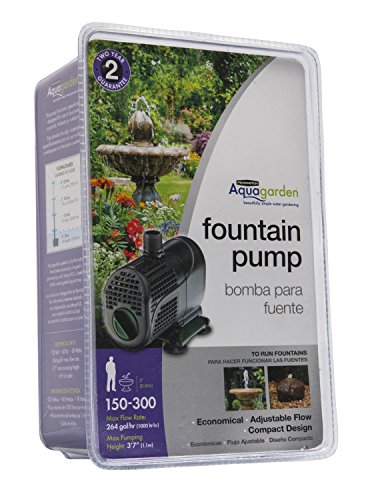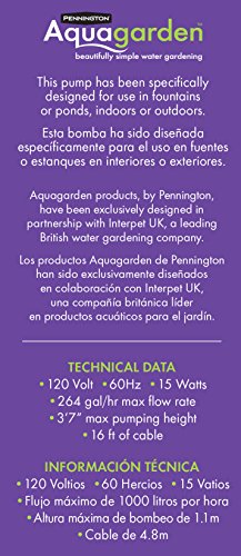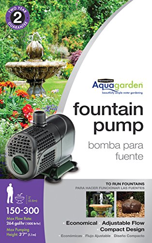The Aqua garden Universal Fountain Pump has been designed for use in fountains or ponds, either indoors or outdoors. The economical, compact design pumps water around your water fountain and the adjustable flow control gives you the flexibility to change the height and speed of the water. The high surface area inlet pre-filter cover is designed to minimize blocking and reduces cleaning frequency so you can spend more time enjoying your attractive water fountain. This pump also features a removable, stable foot for flexible location. Includes: Fountain Pump (120 Volt, 60Hz, 15 Watts, 264 gal/hr. maximum flow, 3’7” maximum pumping height and 16’ cable) and a hose fitting to fit –½”, ¾” & 1”.Feature