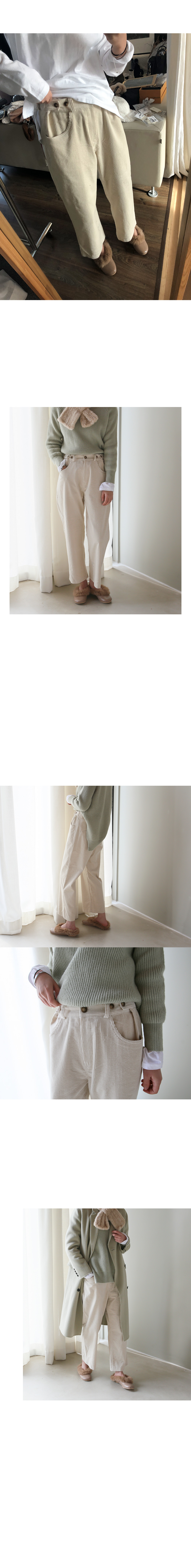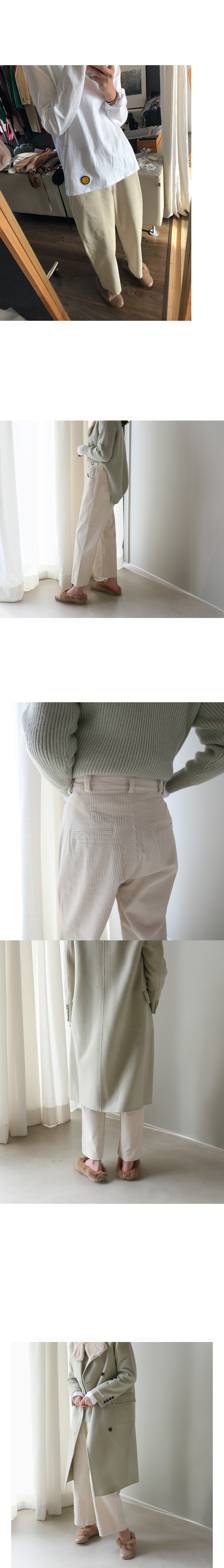 트렌디한 오버핏 팬츠 소개해요 세로의 골덴 패턴이 슬림 하면서도 전체적으로 여유있고 허리 단추조절로 볼륨감있게 떨어지는 라인이 체형 커버를 도와줘요~ 도톰한 두께감과 여유있는 밑위로 편안하게 입어졌답니다^^ 피팅 컬러와 사이즈는 아이보리,Free입니다