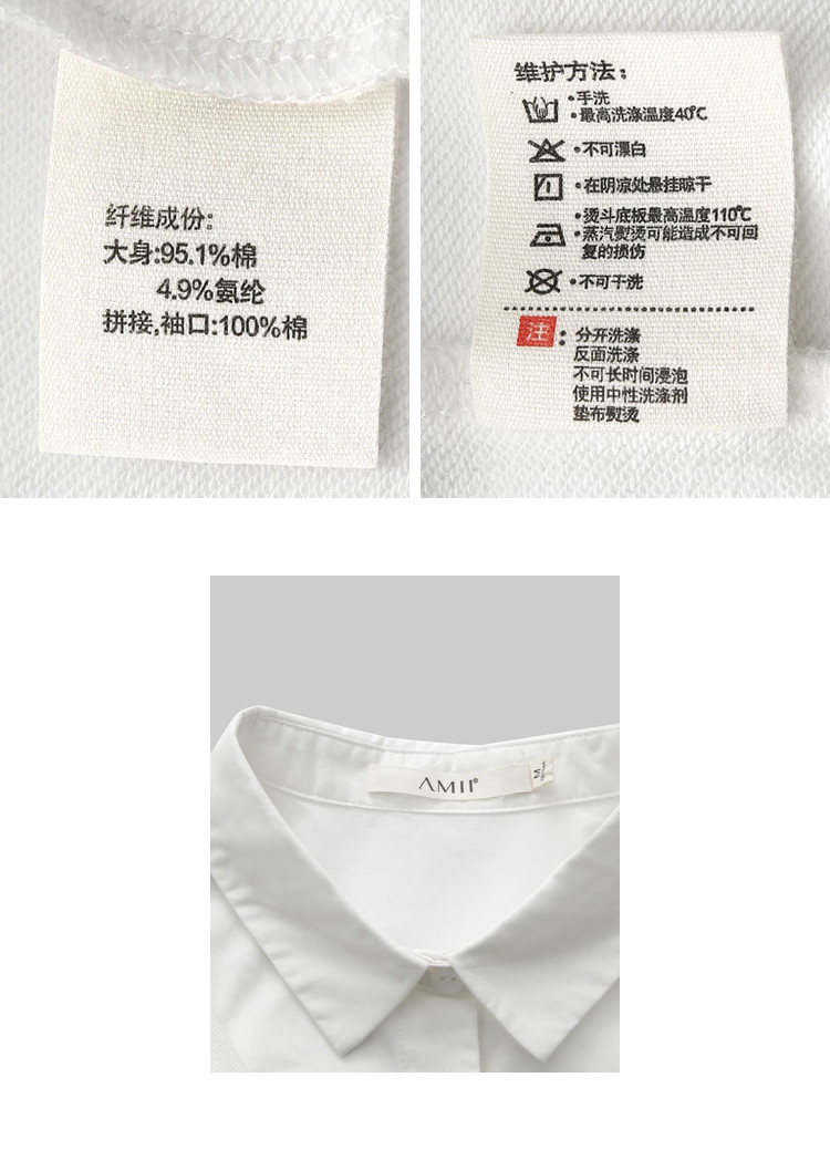 | 面料成分: | 大身:95.1%棉,4.9%氨纶 拼接,袖口:100%棉 |