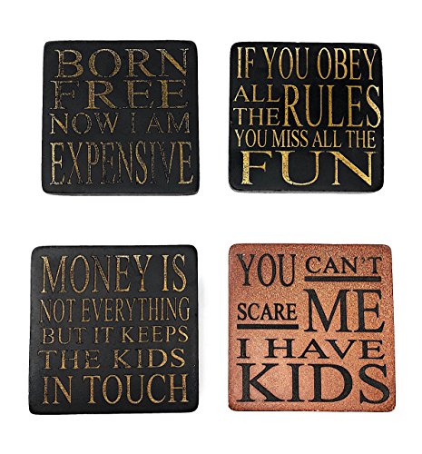 - WINE COASTERS: The coasters includes: Set “BORN FREE now I am EXPENSIVE,” “MONEY is not everything but it keeps the KIDS IN TOUCH,” “YOU can’t scare ME I HAVE KIDS,” “If you obey all the RULES you miss all the FUN.”