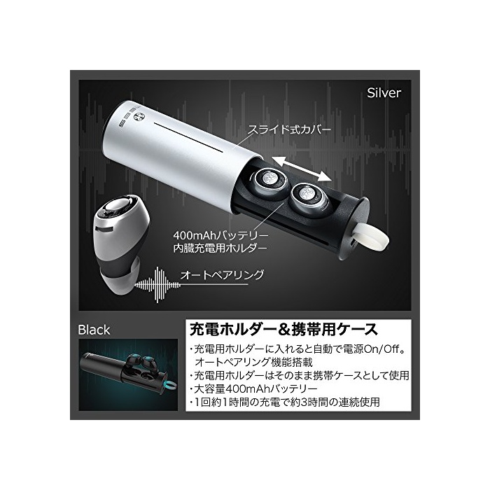 ■ 충전 홀더&휴대용 케이스 충전용 홀더에 넣으면 자동으로 전원On/Off.오토 페어 링 기능 탑재.충전용 홀더는 그대로 휴대 케이스로서 사용.대용량400mAh배터리 내장.1회 약1시간의 충전으로 약3시간의 연속 사용.