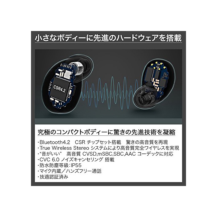 ■ 궁극의 콤팩트 바디에 놀라움의 선진 기술을 응축 Bluetooth4.2 CSR 팁(칩) 세트 탑재 놀라움의 고음질을 재현.True Wireless Stereo 시스템에 의해 고음질 완전 wireless를 실현. ''음이 좋다'' 고음질 CVSD,mSBC,SBC,AAC CODEC로 대응.방수 방진 등급 : IP55 마이크 내장 / 핸드프리 통화기 적인증 이 끝난 상태