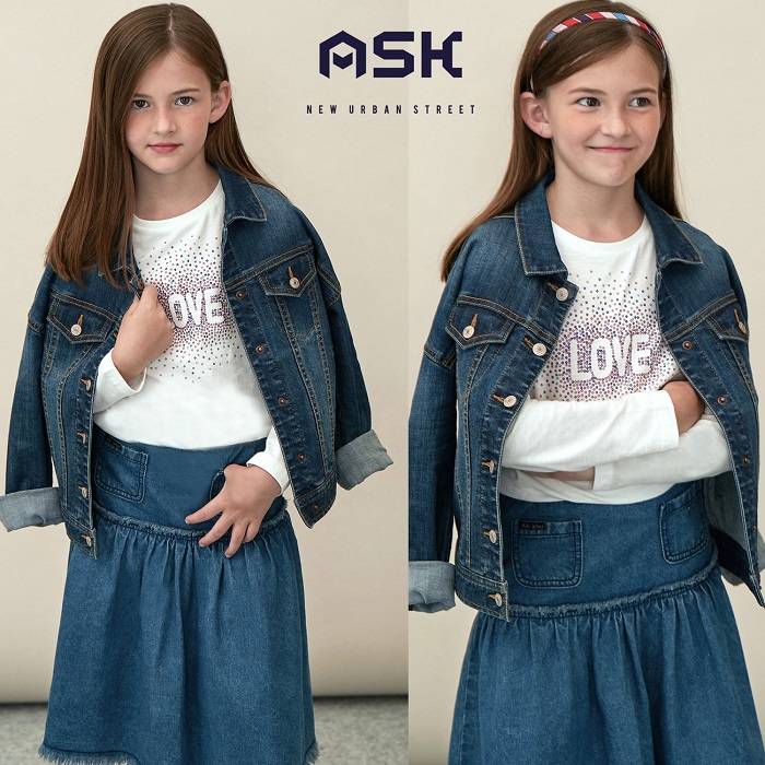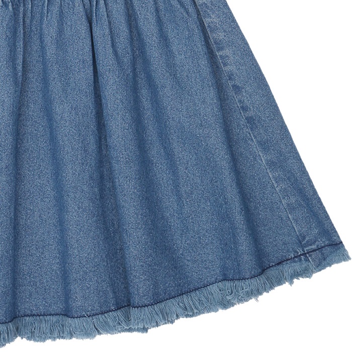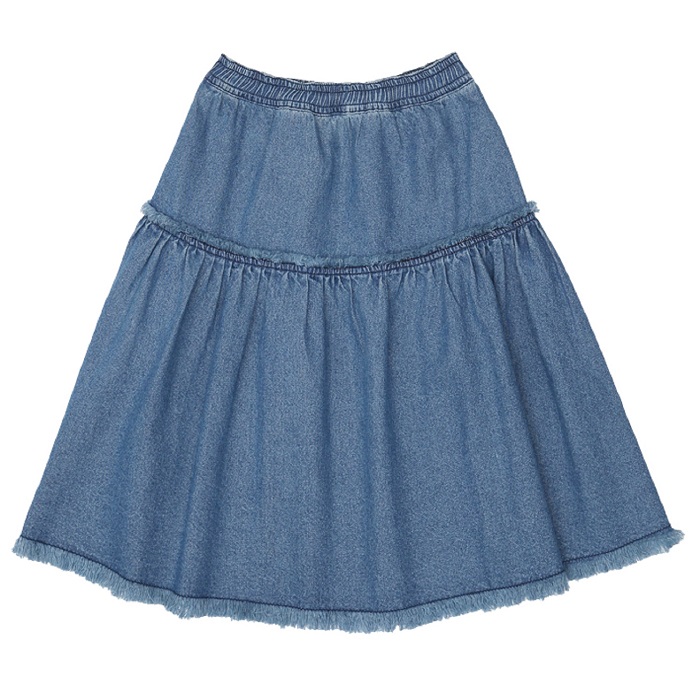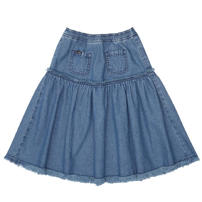 앞에 아웃포켓을 넣어 포인트를 준 여아 미디기장의 데님스커트입니다.