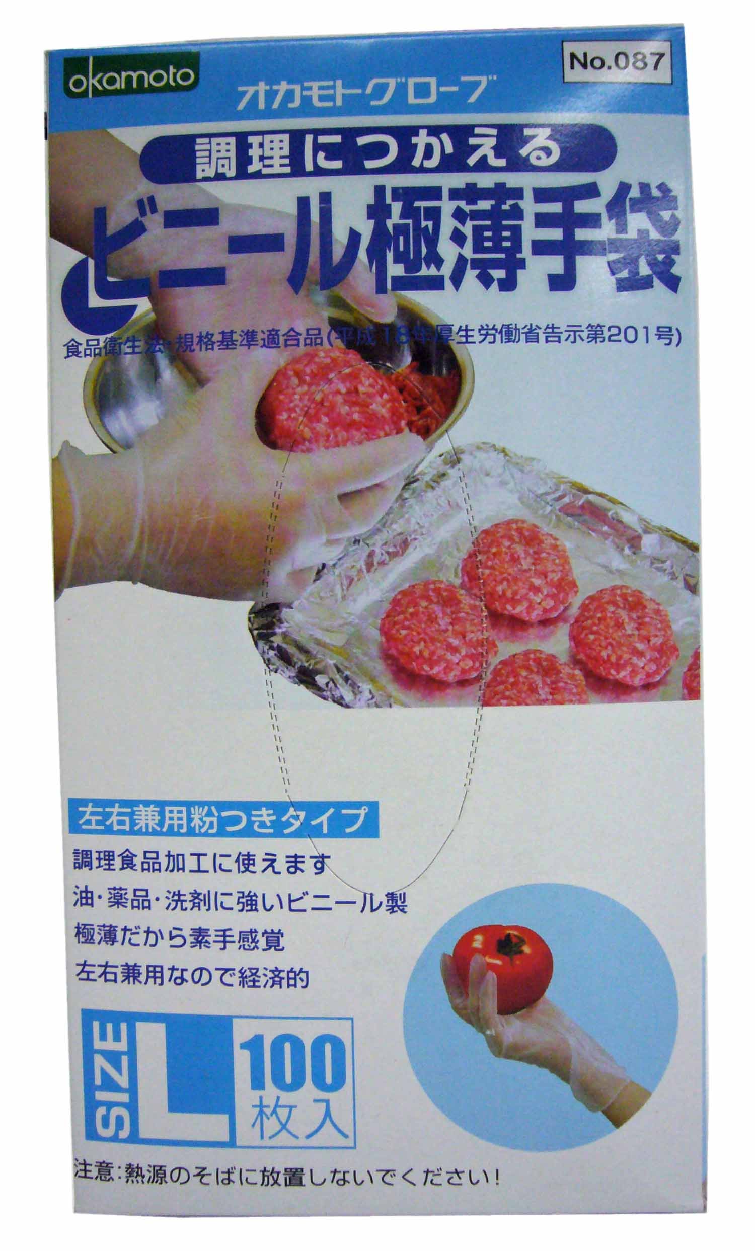 "Okamoto Gloves Vinyl ultra-thin bag L 100 sheets for cooking" is a vinyl glove that is strong against oils, chemicals and detergents.