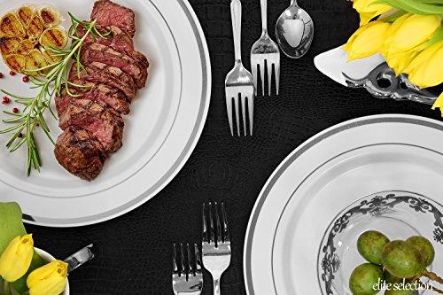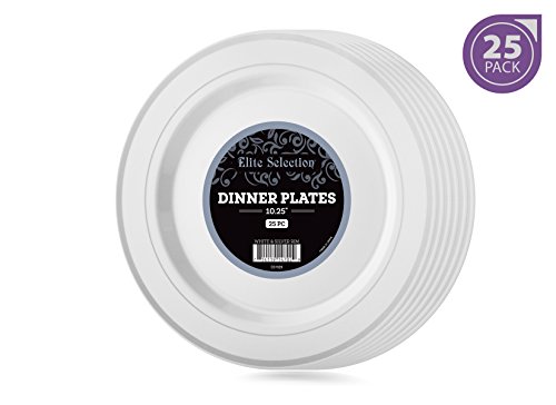 Elite Selection Pack of 25 White Dinner Disposable Party Plastic Plates With Silver Rim 10.25-Inch