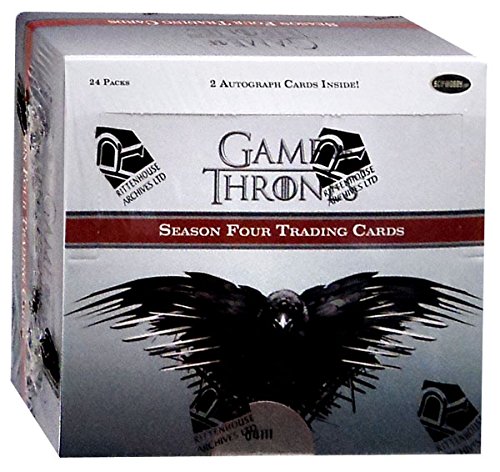 -. Binding : Toy -. Brand : Game of Thrones -. EAN : 0693195150423 -. Feature : 2 Autograph Cards Per Box! / The 100-card base set includes plot synopses for all season four episodes, plus bios for more than 60 characters. / Look for bonus parallel base cards (1:3 packs) / Collect the 9 "Quotable" Game of Thrones cards (1:12 packs), 20 "Valar Morghulis" ("All Men Must Die") cards (1:24 packs) and 20 "Beautiful Death" art cards. / Look for the very rare (1:144 packs) Game of Thrones Shield/Pin cards & hand-drawn SKETCH cards! -. IsAdultProduct : 0 -. Label : Rittenhouse Archives -. Manufacturer : Rittenhouse Archives -. MPN : 3197847 -. PartNumber : 3197847 -. ProductGroup : Toy -. ProductTypeName : TOYS_AND_GAMES -. Publisher : Rittenhouse Archives -. Studio : Rittenhouse Archives -. Title : Game of Thrones Season 4 Factory Sealed Box of 24 Trading Card Packs -. UPC : 693195150423