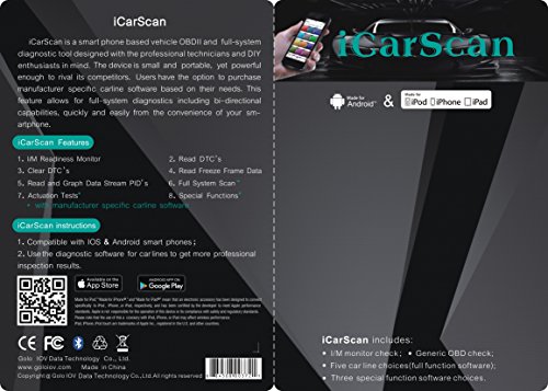 -. Feature : 1. LAUNCH ICARSCAN will send from our USA warehouse, You can get it in 3 days ,Multi-Language: English, Chinese, Spanish, French,Russian / 2.LAUNCH ICARSCAN OBD2 bluetooth Adapter Build-in bluetooth , easily connects with Android/ios smartphone and tablet / 3.8 free brand of software for you select .Five car line choice(fullfunction software),Three specica function software choice.if you need more other softwares, pls buy it from APP store. / 4.Full systems and complete function diagnosis for the most extensive coverage of OE-level diagnostics / 5.Widest carline software coverage: Support the generic OBD, CAN bus, and proprietary protocols of over70 car manufacturers and2, 500 car models;