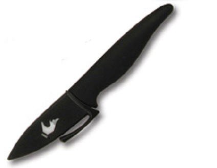 These ceramic blade kitchen knives from Starfrit Gourmet stay sharp up to times longer than steel blades. The three inch fruit knife has a soft grip ergonomic handle and includes its own protective cover for storing.