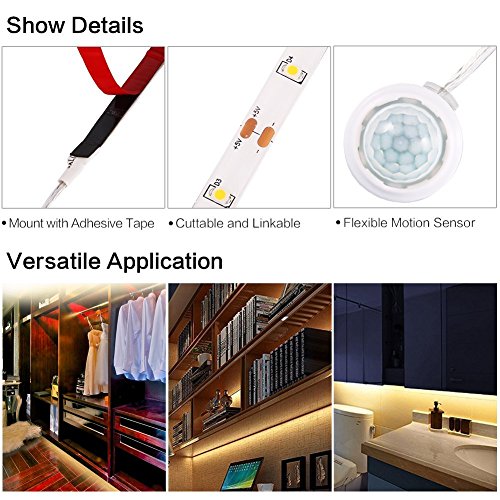- Motion Activated -- Built-in human body passive infrared (PIR) motion sensor light with automatic shut-off timer. Automatic Turn on and Shut off by human induction in the dark environment. Motion Sensor Range: 3-5m / 9.8-16.4ft