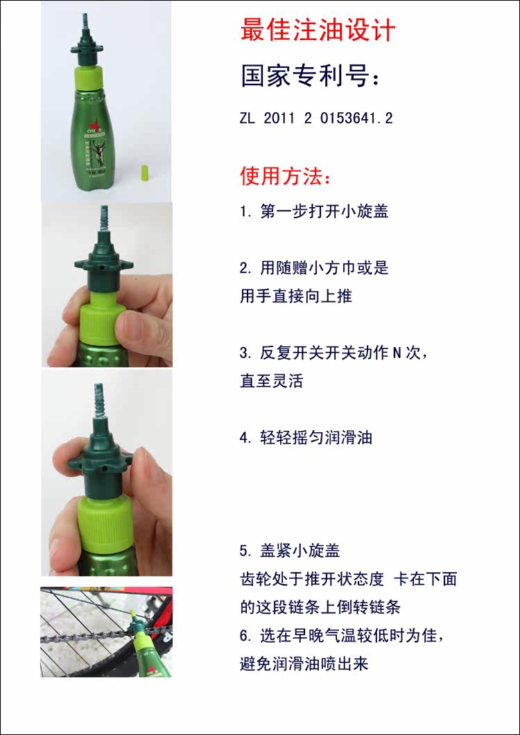 The product is?mainly aimed at the?athletic?type?bicycle chain,?transmission,?brakes?and other transmission parts of the?special lubricating oil,?containing nano?additive and?DuPont Teflon?secondary?particles,?have?stronger anti?wear,anti?dust,?different noise elimination?performance.?Can adapt to the?name of?the traffic?and weather,?and the effect of persistent,?can make?riding more?smoothly.?The?use of lubricating oil?sailing?patent?new design,?make the?processmore efficient?oil.