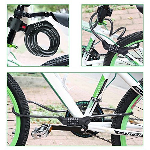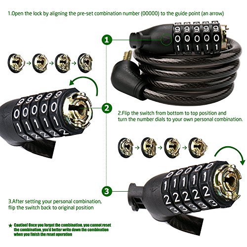 -. Feature : Security: 5-digit password makes thousands of combinations to keep your bike safe. / Easy to Reset : Smart 5-digit resettable combination. The original password is 00000, it's easy to reset password and start with your personal password. Please refer to the following reset password steps in the description part. / Duration: Flexible steel cables for strong cut resistance and PVC coating helps prevent scratching and keeping more durable. / Dimensions: 1.2m long/12mm diameter, with a mount , for which you can easily carry it anywhere without a backpack or basket. / Multi-Function: Ideal for bicycle lock, combination lock, cable lock, Skateboards, sports Equipment, Gates & fences, grills & lawnmowers, tools, tool boxes & ladders