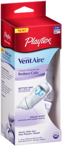 -. Binding : Baby Product -. Brand : Playtex -. Feature : Features breakthrough micro-channel vent technology that vents air at the back of the bottle versus through the nipple, which prevents air from mixing with milk and provides a virtually bubble-free feeding / Angled bottle promotes the semi-upright feeding position recommended by pediatricians to help prevent ear infections / Uniquely designed to reduce colic / Fewer parts to clean at home / BPA-free and phthalate-free -. Label : Playtex -. Manufacturer : Playtex -. ProductGroup : Baby Product -. ProductTypeName : BABY_PRODUCT -. Publisher : Playtex -. Studio : Playtex -. Title : Playtex VentAire Advanced Wide Bottle, 9 Ounce