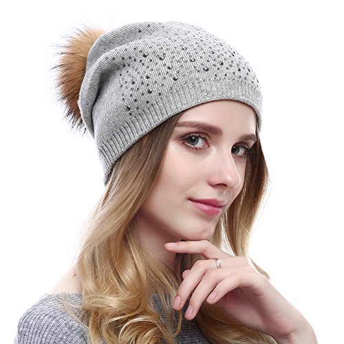 -. Feature : High-end Materials:30% cashmere, 50% acrylic, 20% cotton, fansion rhinestones, fell soft and smooth,comfortable to Wear. / Double design with lining: double lining design keeps your head warm in all situations, no matter if there is snow or cold wind. / Detachablel Pompom:fashion design with fluffy raccoon fur pom pom,around 15-16cm / One Size Fits All: Good flexibility and elasticity, suitable for headband size of 52-60cm. / What You Get:1 knitted cashmere beanie with raccoon fur pompom on top, 1 rex rabbit fur pompoms keychain as a gift and 90 days full warranty.