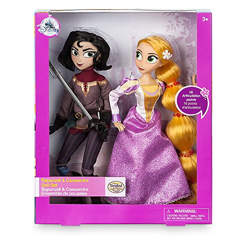 -. Binding : Toy -. Brand : Disney -. Feature : Genuine, Original, Authentic Disney Store / Set of two dolls with styled hair and removable costumes / Extremely poseable: 16 articulation points / Rapunzel's hair ornamented with plastic flowers and bead ''scrunchies'' / Rapunzel's dress: white and gold satin bodice and sleeves, glittering skirt, lace trim at cuffs and hem -. IsAdultProduct : 0 -. Label : Disney -. Manufacturer : Disney -. Model : 460023584305 -. MPN : 460023584305 -. PartNumber : 460023584305 -. ProductGroup : Toy -. ProductTypeName : TOYS_AND_GAMES -. Publisher : Disney -. Studio : Disney -. Title : Disney Rapunzel and Cassandra Dolls Gift Set - Tangled: The Series - 11 Inch