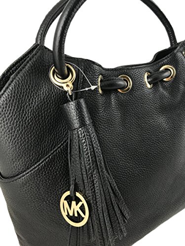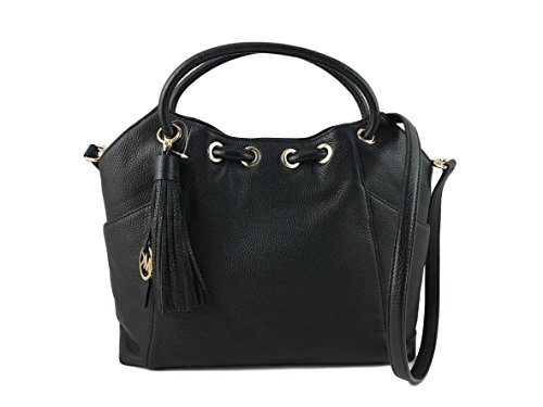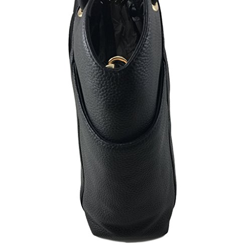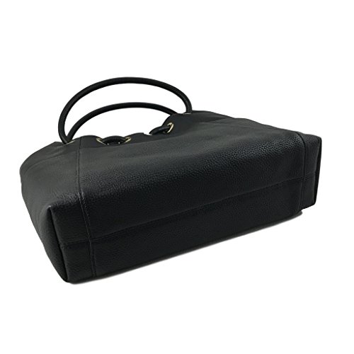 -. Brand : -. Color : Black -. Department : womens -. EAN : 0190049408247 -. Feature : Black leather with gold tone hardware. / Approximate measurement: 15" L x 11.5" H x 4" D, double handle drop 5". / Comes a crossbody bag strap approximate 20" to 24" adjustable . / Exterior: 2 slip pockets on the side, Interior: 1 zipper pocket, 4 slip pockets. / Magnetic closure. -. ProductGroup : Shoes -. ProductTypeName : HANDBAG -. Title : Large East West Leather Ring Tote Shoulder Bag In Black -. UPC : 190049408247