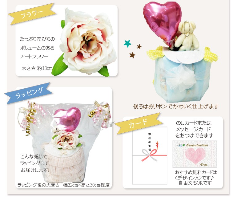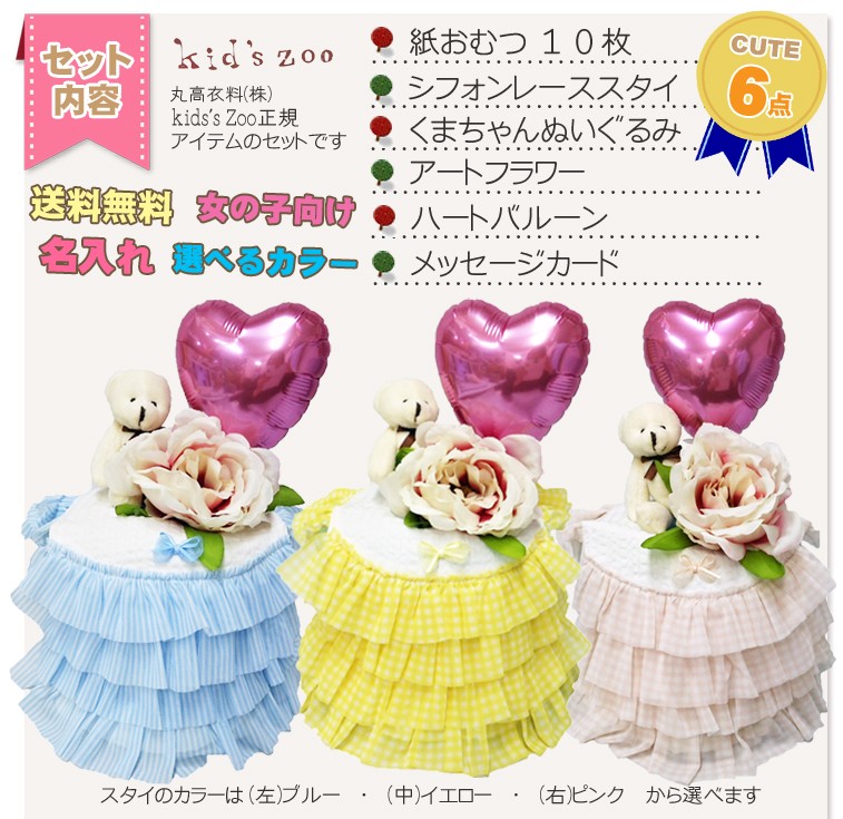 ご出産祝いぴったりたっぷりチュールレースが女の子らしくて華やかなスタイをおむつケーキに仕立てました。3色からカラーが選べます。<使用するおむつ> パンパース(テープタイプ)10枚 S,Mから選択できます。<付属品> ・スタイ(ブルー・イエロー・ピンクから選択) ・くまマスコットキーホルダー ・ハートバルーン(名入れ可) ・アートフラワー ・メッセージカード<バルーンへの名入れ> 無料で名入れができます。(ローマ字のみ大文字小文字OK) ※小文字13文字程度まで可能。<のし、メッセージカード> 無料でお付けできます。(のしかカードかどちらかとなります) メッセージ内容は当店が用意しました定型メッセージと自由な文面をお選びいただけます。<ご持参用手提げ袋> ご持参に便利な手提げ袋を無料でお付けできます。 ※ご注文者様ご自宅へのお届けに限らせていただきます。 <おむつケーキの本体サイズ> 直径18cm×高さ28cm出産祝い おむつケーキ スタイ バルーン 名入れ 送料無料