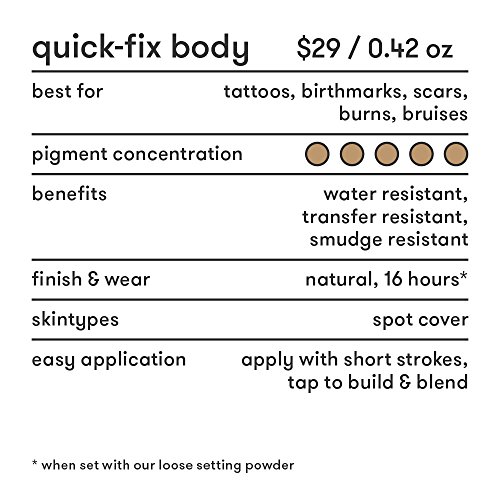 Our full coverage body makeup provides maximum coverage for up to 16 hours of water-, smudge- and transfer-resistant color wear—when set with Dermablend Setting Powder. Formulated for the most sensitive skins, it provides all-day hydration. Featuring a high concentration of high-performance pigments, this creamy texture glides on smoothly for a flawless look whether for spot coverage or a concentrated body surface area. With maximum coverage it conceals tattoos, scars, birthmarks, bruising, burns, and other body imperfections. dermatologist tested. allergy tested. non-comedogenic. non-acnegenic. fragrance free. sensitive skin tested. Product packaging may vary. Ingredients: Araffinum Liquidum /Mineral Oil, Talc, Cera Alba / Beeswax, Isopropyl Palmitate, Kaolin, Stearyl Stearate, Ci 77713 / Magnesium Carbonate, Carnauba / Carnauba Wax, Cera Microcristallina / Microcrystalline Wax, Allantoin, Lauroyl Lysine. [+/- May Contain: Ci 77891 / Titanium Dioxide, Ci 77499, Ci 77492, Ci 77491 / Iron Oxides, Ci 77120 / Barium Sulfate]Feature