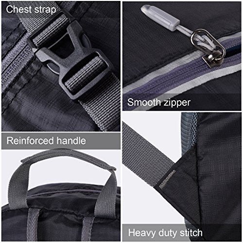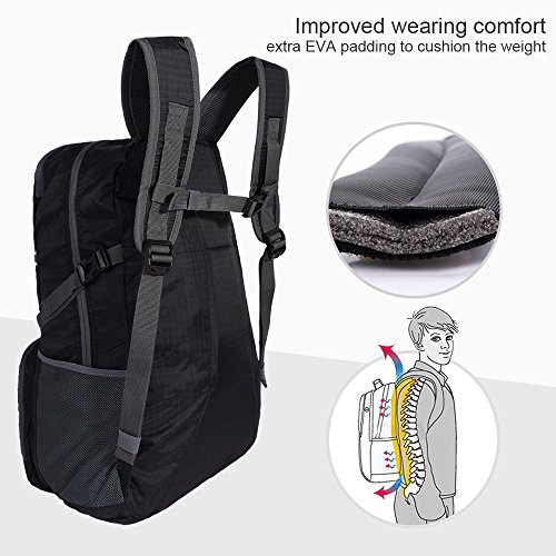 -. Feature : 【A LIGHTWEIGHT PACKABLE TRAVEL BACKPACK】 35L large capacity while cutting weight down to 11.7oz(347g); Max load:7-10kg / 【A FULLY FEATURED HIKING BACKPACK】 The best option in terms of wearing comfort(padded shoulder/back) and construction(sturdy fabric/reinforced stitches/smooth zippers) among light packable backpacks in the market. / 【WELL ORGANIZED POCKETS】 Zippered main compartment+ 3 exterior zips +2 side mesh+ 1 interior divider+1 interior zip+1 removable sternum strap / 【WATER-RESISTANT】 The water-resistant fabric(not water-proof) make it useful in variable weather conditions. / 【VERSATILE PACK】 Folds up into its own pocket and can be packed into main backpack along every trip, perfect for daytrips, travel, hiking, theme parks, festivals, camping, outdoors, and city tours.