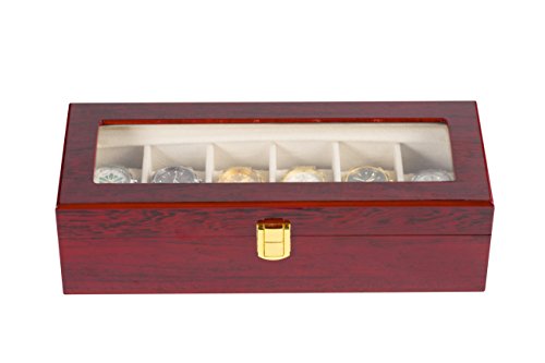 Studio : HARWOO HANDICRAFTS CO.,LTD Publisher : HARWOO HANDICRAFTS CO.,LTD Binding : Kitchen Product Description The HARWOO Brand 6Slots Travel Custom Luxury Wooden Watch Dispaly Box brings gospel for all watch collectors. Sturdy wooden structure and soft cream velvet lining create a cozy home for your watches. Cherry appearance decorates your room with elegance. Glass window in the lid provides clear view. Metal buckle allows for one-hand opening. 6slots with 6soft removable pillows keep your watches in upright positions. What¡?s more, the soft velvet bottom protects your furniture from scratches and damages. HARWOO watch organizers are nice gift choices for your family and friends. Specifications: - Material: Medium Density Fiberboard (MDF), Velvet Lining - Color: Cherry Exterior, Cream Interior, Cream Pillows - Window: Real Glass - Product Size: 31X12.5X8.5CM - Product Weight:0.9 kg - Ready to Use: Yes - Single Hand Opening: Yes Package Content: 1 x Wooden Watch Box