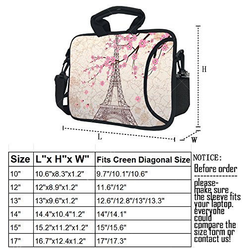 -. Binding : Personal Computers -. Brand : Wondertify -. Feature : Designed by a simple and fashion way to protect your MacBook, Laptop, Notebook Ultrabook computer or iPad. / Made of 100% neoprene, Lightweight,Durable and water resistant. / High quality printing on both side of the bag. / Slim and lightweight design allows you to carry the case by itself or in a bag. / There have seven sizes to choose: 10 inch, 11 inch,12 inch,13-14 inch, and 15 inch,17 inch -. Label : Wondertify -. Manufacturer : Wondertify -. Model : KJ-FT2850 -. MPN : KJ-FT2850 -. PartNumber : KJ-FT2850 -. ProductGroup : PC Accessory -. ProductTypeName : CARRYING_CASE_OR_BAG -. Publisher : Wondertify -. Size : 10-10.1 Inch -. Studio : Wondertify -. Title : Wondertify 10-10.1 Inch Water-resistant Neoprene Laptop Shoulder Bag Sleeve Briefcase - Vintage Floral Paris Eiffel Tower Laptop Carrying Bag Case for iPad Air/Pro/Mini 2/3/4/Surface RT/Pro 2