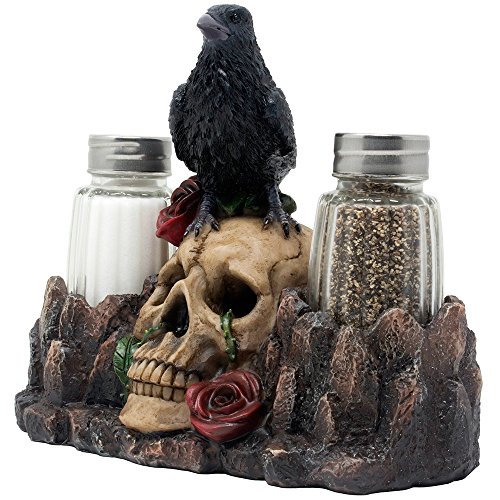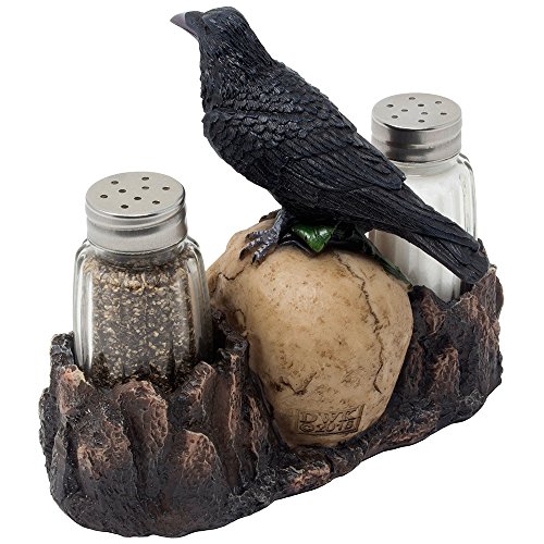 Add an amusing bit of fright to your dinner table with this gravely scary black raven on human skull salt and pepper shaker set. - See full description below.