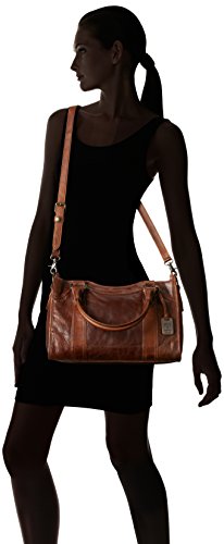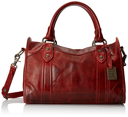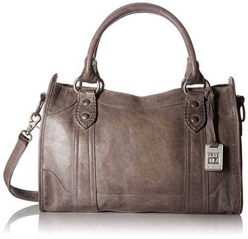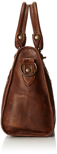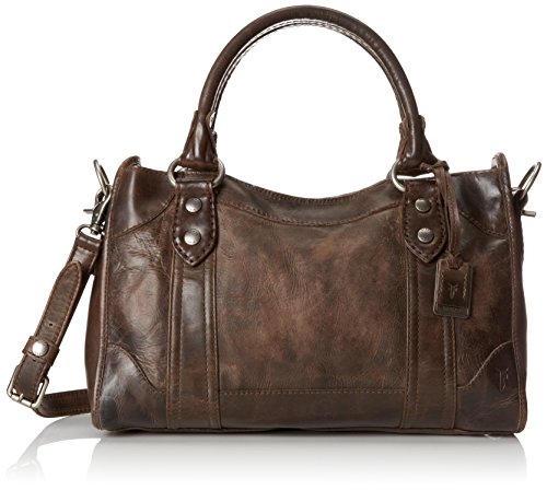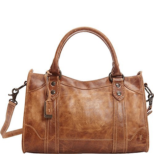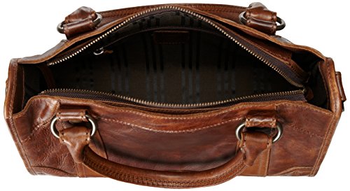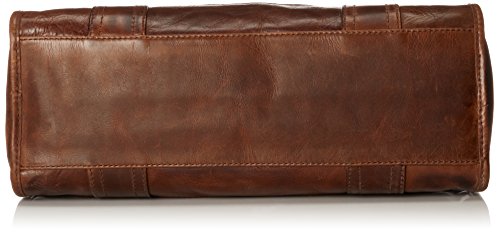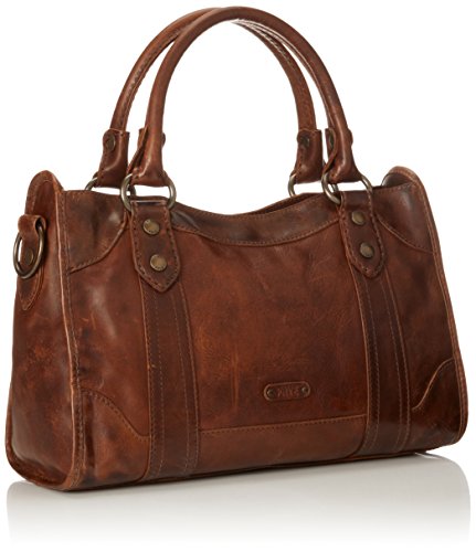Satchel in washed leather featuring antiqued hardware, logo tag, and rolled top handles