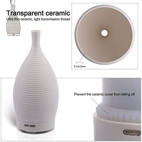 Material: Cap: Porcelain; Base:ABS; Water tank: PP; O-Ring: Silicone Capacity of water tank: About 100ML Working mode: Continuous working mode and Intermittent working mode(mist emits at intervals of 30 seconds, automatically turns off after 6 hours) Misting output: Approx 30ml per hour Electric consumption: Maximum 12 W Input power: AC100-240V 50/60HZ Dimension: Approx (D)3.54 x (H)8.66 (Inches) Keep essential oil 100% natural without burning or heating and automatic shut off safely.
