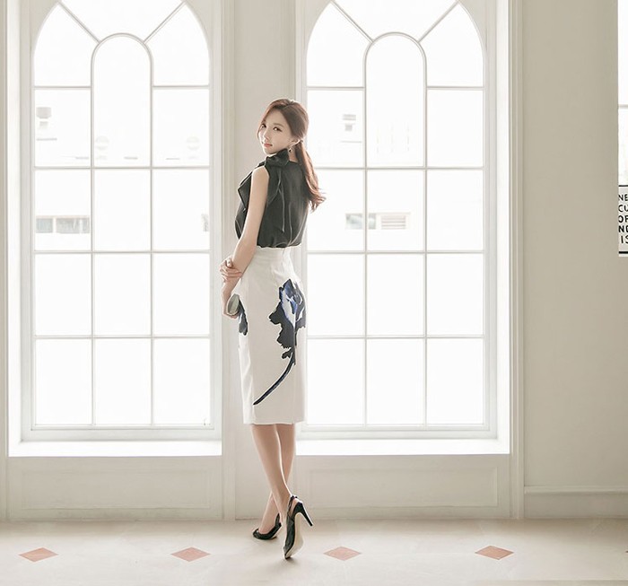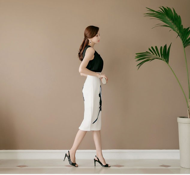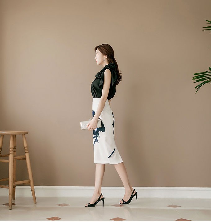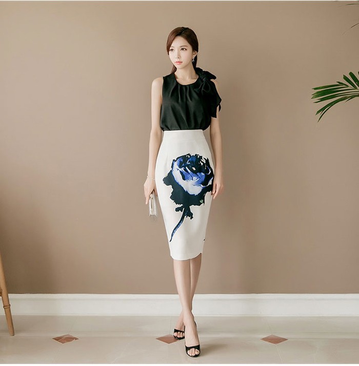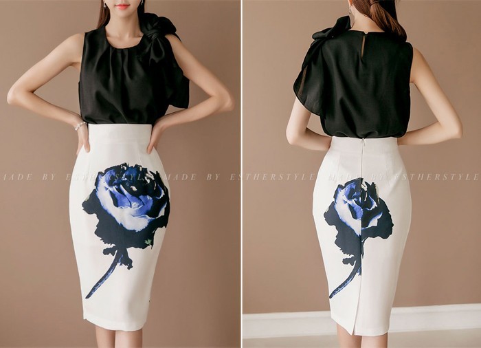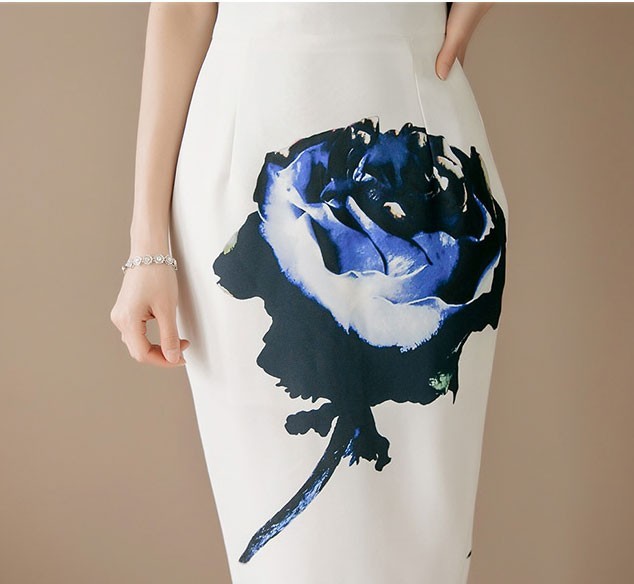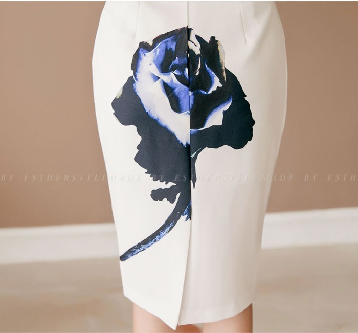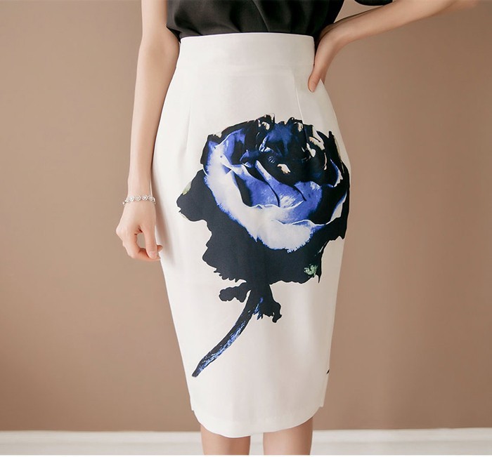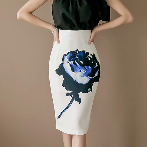 商品名:ペンシルスカート タイトスカート ハイウエスト 花柄 プリント 膝丈