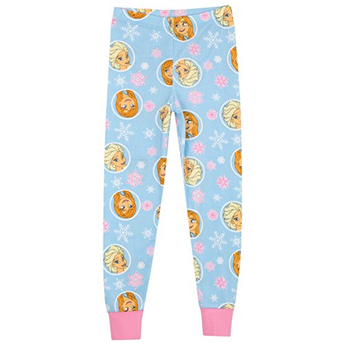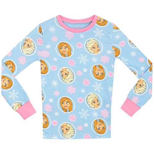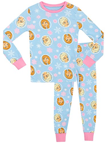 Girls Disney Frozen pajamas. Make bedtime extra magical for your little princess with these stunning Frozen pjs. Consisting of a long sleeve top and full length bottoms with cuffed ankles, this pajama set features a matching all over pattern print of the much loved sisters Anna & Elsa as well as snowflakes against a pretty pastel blue background. She's guaranteed sweet dreams with these snug fit Frozen pjs.Feature
