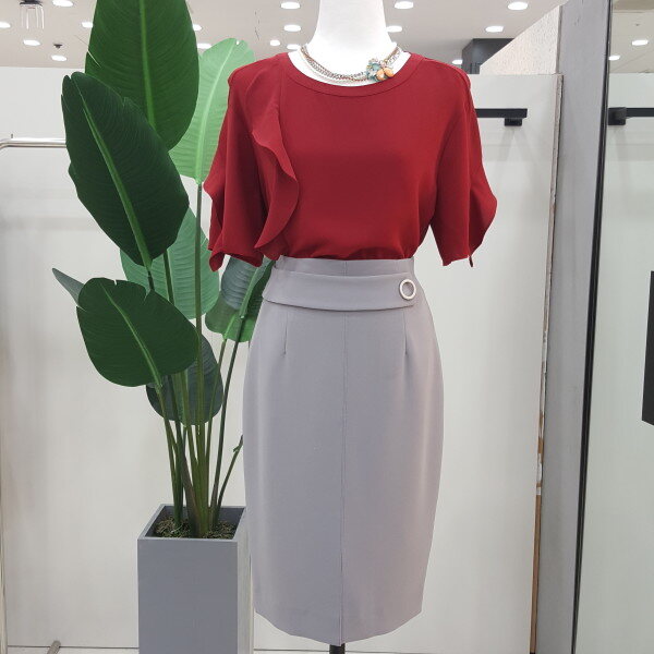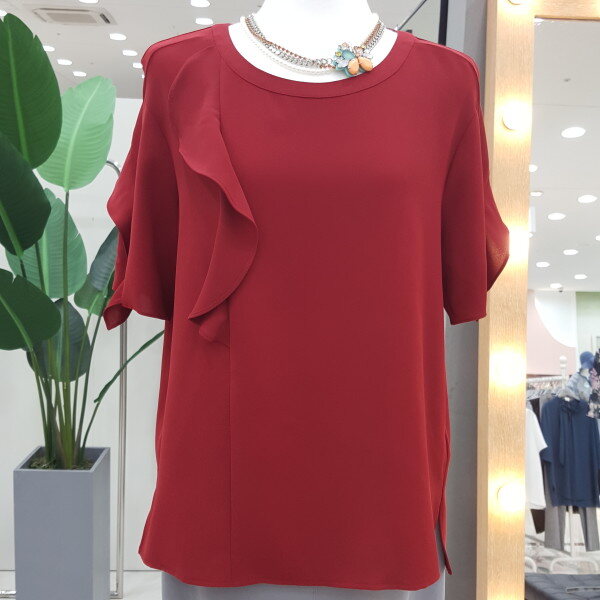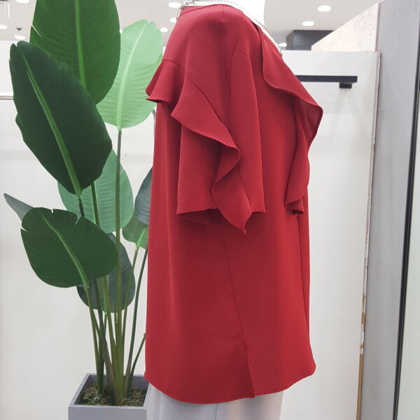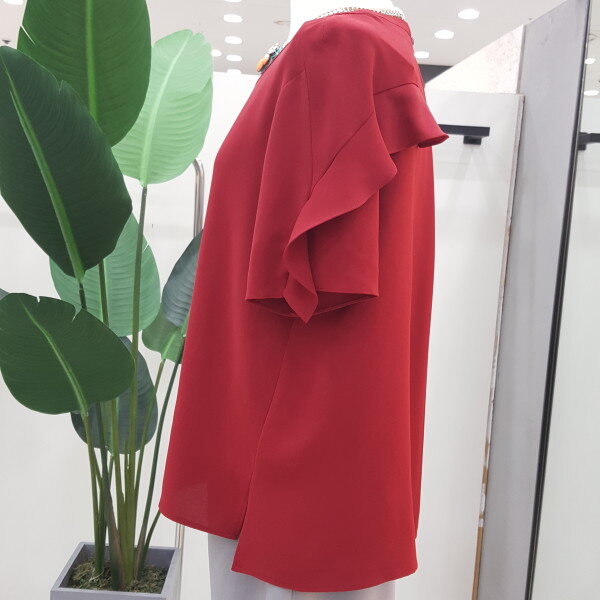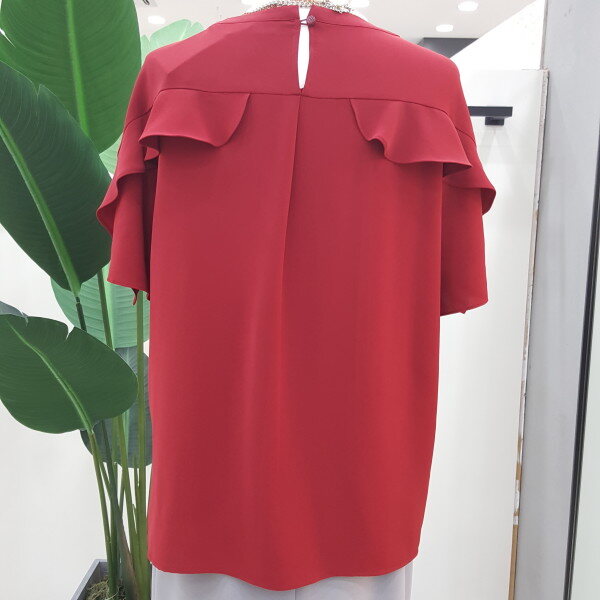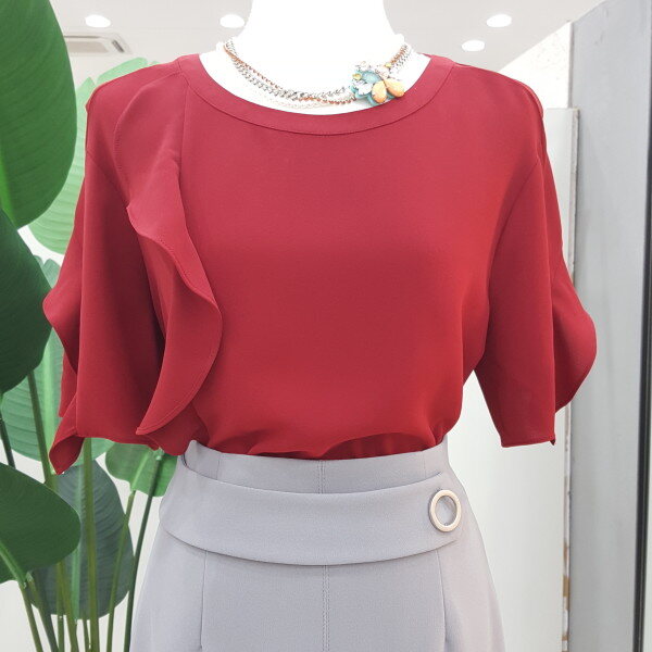 가슴선과 어깨선으로 프릴장식이 있어 우아하고 고급스러운 느낌을줍니다.컬러감이 멋진 블라우스입니다.