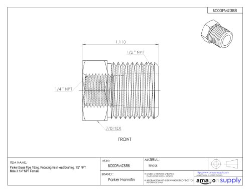 Parker Brass Pipe Fitting, Reducing Hex Head Bushing, 1/2" NPT Male X 1/4" NPT Female