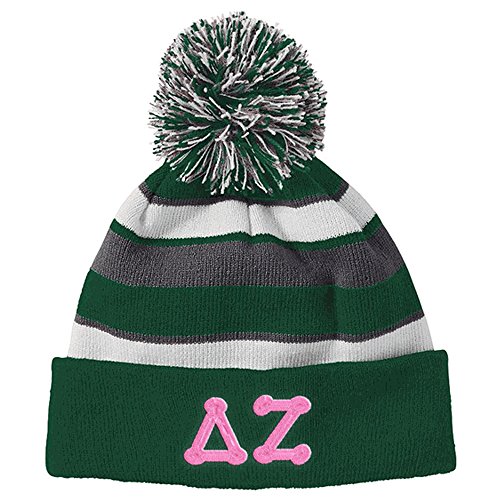 Product DescriptionDelta Zeta Lettered Comeback Beanie Warm and soft 100% acrylic rib knit Tri-color pom-pom detail on top Folded hem Fit type: One size - Great cute Greek font.0